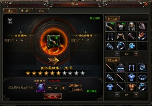 强化系统: 1。强化单个装备,增加对应属性。 2.。强化消耗金币,强化等级越高成功的概率越低。 3。使用黑铁矿可以增加成功的概率。 4.。强化失败后除了金币外,不会有任何损失。