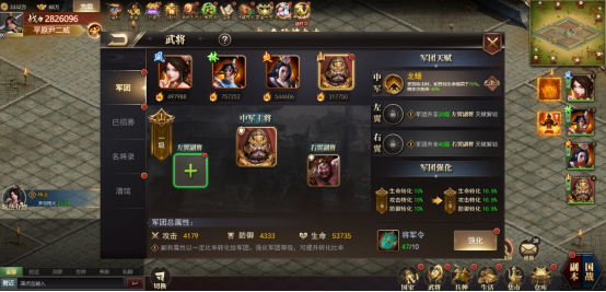 主公点击武将按钮即可进行布阵,点击“+”号之后可以进入武将选择界面,点击想要上阵的武将后面的上阵按钮即可上阵该武将